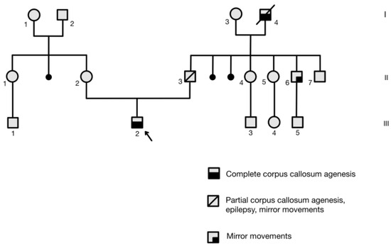 Neuroanatomic features and mirror movements (MMs) in family members with DCC mutation. I-4 and III-2: Complete ACC, MMs. II-3: Partial ACC, MMs. II-6: Normal corpus callosum (CC), MMs. Arrow indicates the proband. Numbers 1-7 indicate individual family members for each generation.