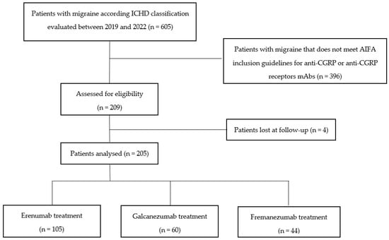 Between 2019 and 2022, mAbs erenumab, galcanezumab and fremanezumab were prescribed in our headache center to 209 patients suffering from migraine according to the ICHD criteria 2018 of IHS and to AIFA guidelines. Patient demographics and baseline characteristics are summarized in Table 1.