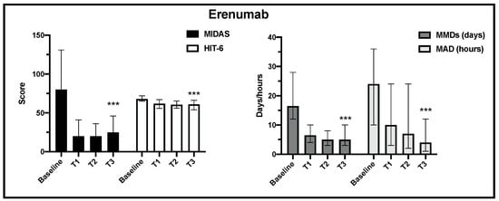 Change in MIDAS, HIT-6, MMD and MAD scores from baseline to the end of observation in erenumab treatment (T3) (*** p < 0.001).