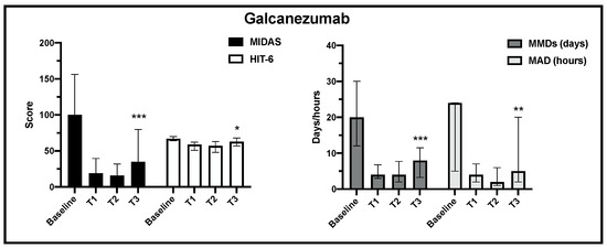 Change in MIDAS, HIT-6, MMD and MAD scores from baseline to the end of observation in galcanezumab treatment (T3) (*** p < 0.001, ** p < 0.01, * p < 0.05).