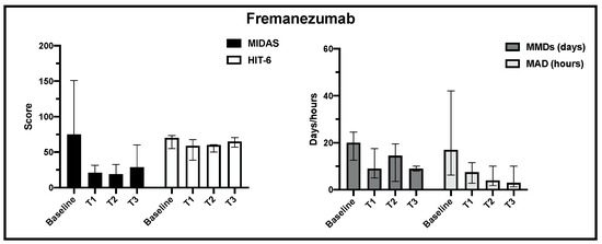 We collected all data regarding mAbs erenumab, galcanezumab and fremanezumab treatments from the clinical documentation related to the institutional scheduled medical examination for headache patients. Demographic, medical, and clinical characteristics were summarized by descriptive statistics. We analyzed the data of the patients undergoing mAbs treatment of whom the MIDAS, HIT-6, MMDs and MAD scores at baseline visit and at least at one of the following medical assessments had previously been recorded. The MIDAS, HIT-6, MMDs and MAD questionnaires are administered to all headache patients referred to our center as part of routine clinical care. Categorical variables were expressed as numbers and percentages, while quantitative variables were expressed as medians and interquartile ranges (IQR). For paired data analysis, non-parametric Wilcoxon signed-rank test was used to compare differences in MIDAS, HIT-6, MMDs and MDA scores from baseline (T0) to end of observation (T3, 13 months). Statistical analysis was conducted using STATA statistical software, release 18 (StataCorp, College Station, TX, USA) setting the statistical significance at p < 0.05. All the graphs and related analyses were performed using GraphPad Prism software version 8.0 for Mac (GraphPad Software, San Diego, CA, USA).