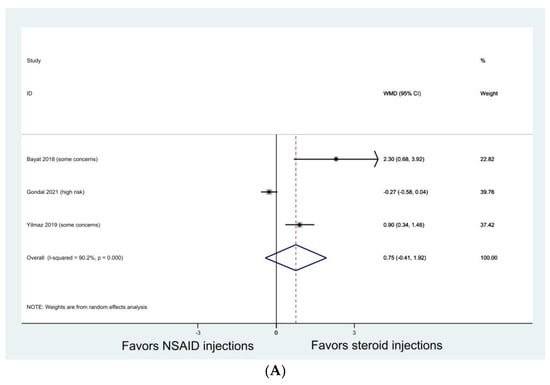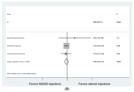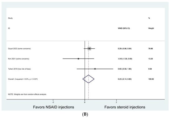 In nine studies that reported VAS [26,29,31,36,38,41,42,48,50], both NSAID injections and steroid injections significantly improved pain at the end of their follow-ups. Our meta-analysis of five studies [26,31,36,41,50] demonstrated that there was no significant difference in pain VAS between the NSAID injection and the steroid injection at 1 month (Figure 3A, WMD −0.244; 95% CI, −1.232 to 0.745; I2, 94.5%). Our meta-analysis of three studies [31,36,41] demonstrated that there was no significant difference in pain VAS between the NSAID injection and the steroid injection at 3 months (Figure 3B, WMD 0.235; 95% CI, −0.135 to 0.604; I2, 8%).