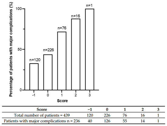 Major complications included in the analysis were pneumonia, sepsis, pulmonary embolism (PE), postoperative bleeding, and anastomotic leakage. A total of 236 patients (54%) had at least one major complication.