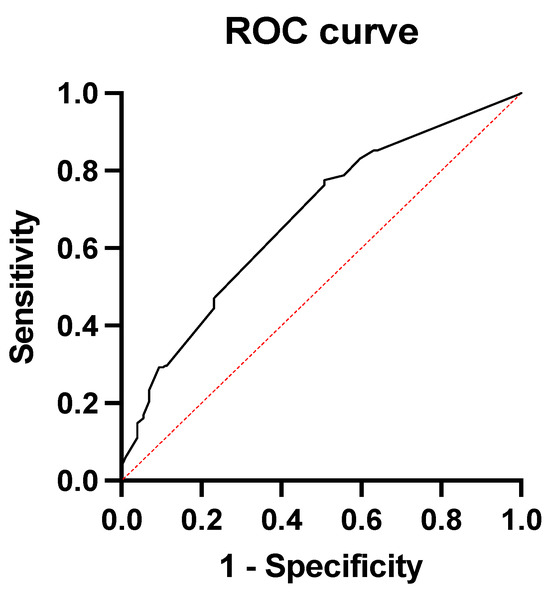 An ROC curve was then constructed to visualize the trade-off between high sensitivity and high specificity in discriminating between low- and high-risk patients. The score based on comorbidities significantly correlated with the occurrence of major complications in patients following esophagectomy with an area under the curve (AUC) value of 0.675 (95% CI: 0.62–0.72, p < 0.0001). The ROC curve is shown in Figure 2.
