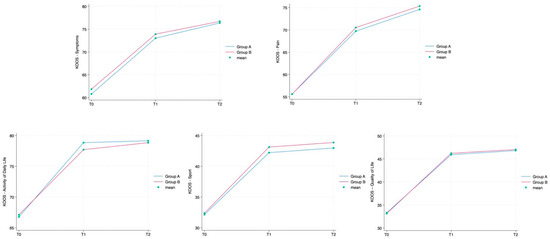 Table 2. The NRS showed a statistically significant reduction in subsequent time points in both groups (group A: T1 6.6 ± 1.0 (4–8), T2 2.5 ± 0.8 (1–5), T3 2.2 ± 0.7 (0–4); group B: T1 6.7 ± 1.0 (4–8), T2 2.2 ± 0.7 (0–4), T3 2.0 ± 0.7 (0–4)). In all the KOOS scale’s sections, values increased between T0 and T1 and T2 in group A as well as in group B in a statistically significant way (