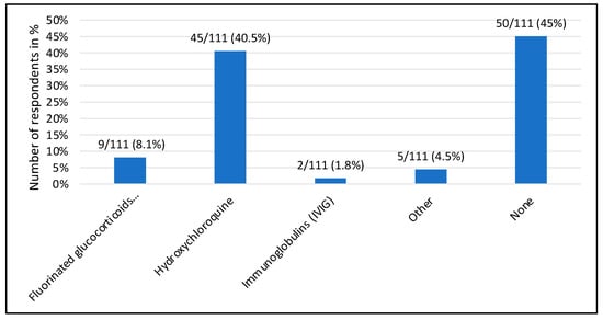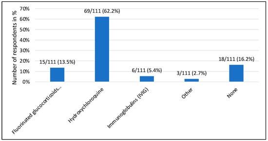 Of the 111 specialists, 45 (40.5%) consider prophylaxis with hydroxychloroquine to be useful in the case of a seropositive primigravida, while 50 (45%) do not recommend any drug prophylaxis and 9 (8%) would start fluorinated steroids as prophylaxis. (Figure 2).