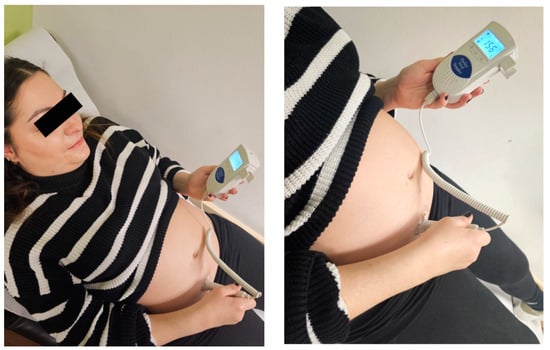 The twelve enrolled mothers returned a total of 83 weekly documentation forms. Of these women, 82% fully completed the home monitoring protocol—measuring the fetal heart rate three times a day using a handheld Doppler. This means that they carried out 1428 of a total of 1743 fetal heart rate measurements. Figure 4 shows a patient using the handheld doppler device. The reasons for not performing fetal heart rate measurements included that the women forgot the Doppler device while travelling. For multiparous women, their daily routine with another infant was the main reason for omitting measurements. None of the patients contacted the center during the entire period due to an abnormal fetal heart rate or problems/insecurities with measurement.
