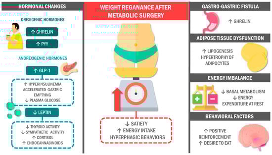 Potential mechanisms associated with weight regain after metabolic surgery. However, the surgery results are not always as expected. On the contrary, patients exhibit altered levels of orexigenic hormones that promote appetite and an excess of certain anorectic hormones that could lead to metabolic alterations associated with weight regain. Likewise, post-surgical dietary changes can be associated with developing an energy gap that favors excessive food consumption. In addition, post-MS patients tend to have maladaptive eating patterns capable of eliciting ingesting amounts of food similar to those before surgery. Abbreviations: GLP-1: glucagon-like peptide 1; PYY: peptide YY; MS: metabolic surgery.