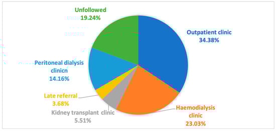 Figure 1 reports the distribution of ESKD subjects considering the nephrology follow-up and type of nephrology clinic. Table 1 reports age and gender in the entire population and all subgroups (followed, unfollowed, haemodialysis patients, peritoneal dialysis patients, kidney transplant patients, late referral, and outpatients).