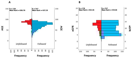 Age (A) and eGFR (B) distribution in followed and unfollowed ESKD patients.