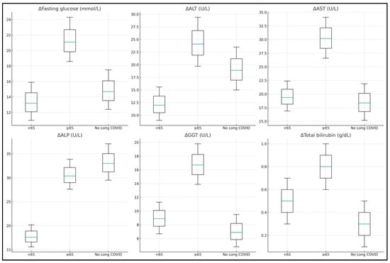 Alkaline Phosphatase (ALP) and Gamma Glutamyl Transpeptidase (GGT), other markers for liver health, were similarly elevated in the Long COVID groups, particularly in those aged 65 and above, suggesting possible cholestasis or biliary injury (p < 0.001 for both). Total bilirubin levels were also significantly higher in the Long COVID groups, particularly in the older patients, indicating possible liver dysfunction (p = 0.002).
