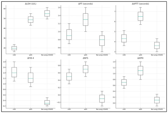 Interestingly, while the Serum Albumin and Total Protein levels were closer to the normal range, they remained significantly different across the groups, with the elderly Long COVID group showing lower median values compared to the control group, potentially indicating ongoing nutritional or synthetic liver issues (p = 0.038 and p = 0.022, respectively). Coagulation profiles, as indicated by Prothrombin Time (PT) and Activated Partial Thromboplastin Time (APTT), remained altered in Long COVID patients, especially in those aged 65 and above, suggesting a persistent pro-thrombotic state or ongoing liver dysfunction affecting coagulation (p < 0.001 for both).