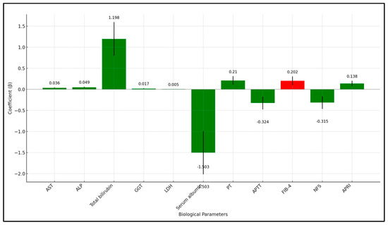Several biological parameters changed significantly in association with liver injury severity. Increases in AST and ALP were associated with increased liver injury severity, with coefficients of 0.036 (p < 0.001) and 0.049 (p < 0.001), respectively. Total bilirubin showed a substantial positive association with a coefficient of 1.198 (p = 0.003), indicating that higher changes in bilirubin levels were associated with greater liver injury severity. Conversely, higher changes in Serum Albumin levels were associated with a decrease in liver injury severity, with a coefficient of −1.503 (p = 0.005). Changes in GGT, LDH, PT, APTT, NFS, and APRI also significantly predicted liver injury severity, with varying coefficients.