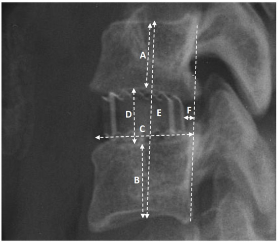 The image of the operated segment in the lateral projection, showcasing the selected radiological parameters utilized in the study: A—height of the upper body; B—height of the lower body; C—length of the lower endplate; D—height of the intervertebral space; E—height of the segment; F—distance of the implant from the medial column (posterior longitudinal ligament).