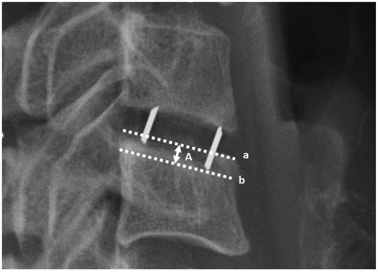 Radiological assessments were conducted via X-rays in lateral projection at five distinct intervals: (1) the day preceding the surgery, (2) the immediate postoperative day, (3) one month post-surgery, (4) six months post-surgery, and (5) twelve months post-surgery. All radiographic images were acquired at the authors’ facility, employing consistent equipment and adhering to standardized procedures. Measurements were meticulously obtained with a precision of 0.1 mm. The assessed radiological parameters, illustrated in Figure 2, underwent evaluation. Clinical outcomes were appraised using the Visual Analogue Scale (VAS) and Neck Disability Index (NDI) during the follow-up imaging sessions. Subsidence was recognized in case implant displacement into the adjacent endplate by ≥2 mm. To assess the degree of subsidence, 3 categories were created based on the magnitude of implant displacement compared to the radiographs taken the day after surgery: (1) implant displacement into the adjacent endplate by ≥2 mm and <3 mm, (2) implant displacement into the adjacent endplate by ≥3 mm and <4 mm, and (3) implant displacement into the adjacent endplate by ≥4 mm. The measurement method is depicted in Figure 3.