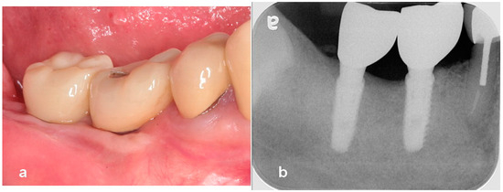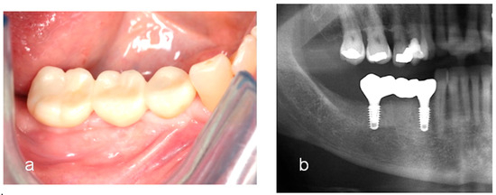 (a) An intraoral image after 5 years of loading. Note healthy gingiva around the definitive fixed restoration. (b) A radiograph showing stable marginal bone at 5 years of function.