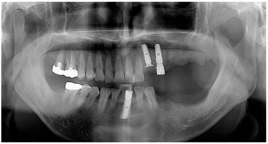 Case 2. A 53-year-old man presented with severe mobility of upper left maxillary posterior teeth, lower left premolars, and lower central incisors. Hopeless teeth were extracted, and implants were placed immediately on the sites of the upper right canine, first molar, and lower left central incisor. He visited our department again to receive an implant-supported restoration in the edentulous left posterior mandible and maxilla after 6 weeks of healing. The extracted teeth were prepared for decalcified osteoinductive particulate tooth bone grafts using a vacuum-ultrasonic machine (VacuaSonic system, CosmoBioMedicare, Seoul, Republic of Korea) 2 h before surgery, and a tooth bone graft was prepared for sticky bone, as described in case report 1. Preoperative radiograph indicated severe three-dimensional bone defects (Figure 5). The surgical procedure was performed under local anesthesia (2% lidocaine with epinephrine 1:100,000) after the intravenous injection of antibiotics (Flomoxef, Flumarin®, Ildong Pharm, Seoul, Republic of Korea). Severe vertical and horizontal defects were revealed after the elevation of a full thickness mucoperiosteal flap. A lingual flap was also released with a periosteal elevator. Under-osteotomy was performed at the first premolar and the first and second molar sites using a drill that was 1 mm narrower than the implant diameter in order to achieve initial implant stability. Implants that were 4.1 mm wide × 11.5 mm long and 5 mm wide × 10 mm long (Biotem Implant, Busan, Republic of Korea) were placed at the first premolar and molar areas, respectively, with favorable stability and as an alternative to tenting pole screw, in order to act as a vertical tenting device. Implant platforms were placed 2 mm subcrestally to the adjacent proximal bone height. A vertical tenting pole abutment (SANTA®, Biotem Implant Co., Busan, Republic of Korea) with a 2 mm cuff height was placed on the implant platform to maintain the volume of the sticky tooth bone graft during the healing period. Then, the 5–6 mm exposure of implants was revealed. Sticky tooth bone was grafted on to the bony defects with the purpose of maintaining space. A collagen barrier membrane (Lysoguide, Oscotec Co., Seoul, Republic of Korea) was used to cover the bone graft, and two concentrated growth factor membranes were placed over the collagen barrier to accelerate wound healing. Tension-free primary sutures were applied. Healing was uneventful until the second surgery. The uncovering was performed after 22 weeks of healing. A plain radiograph and cone beam computed tomogram (CBCT) scan images revealed stable ridge augmentation. To widen the attached keratinized gingiva, a suture-less free gingival graft, as described in case report 1, was performed. A final zirconia-based restoration was delivered after 6 weeks loading of the progressive restoration (Figure 6, Figure 7, Figure 8 and Figure 9).