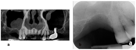 (a) Preoperative CBCT scans indicate a huge retention cyst on the right sinus. (b) A plain radiograph reveals 1 mm of residual bone height and an advanced ridge defect.