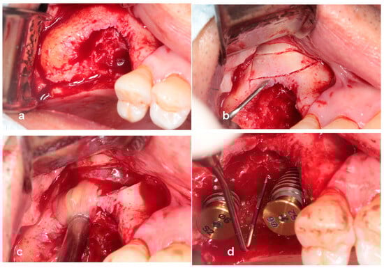 (a) Note the severe three-dimensional bone defect. (b) Replaceable osteoinductive bony window was prepared with a saw insert attached to piezoelectric bone surgery. (c) Cystic content was aspirated with a suction apparatus. (d) Implants were placed simultaneously and tenting pole abutment, as a vertical space maintainer, was placed on the implant platform, maintaining the bone graft over the exposed implant and bony defect. An approximately 10 mm vertical defect was revealed.