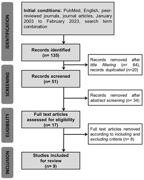 The literature search query retrieved a total of 135 articles, which were subsequently analyzed by two independent reviewers. After removing duplicate articles (n = 20), the remaining articles were accessed and discarded if the title revealed that the topic of interest was not covered in the corresponding study (n = 64). When the analysis of the title proved inconclusive, the abstract was read considering the eligibility criteria, whereupon an additional 34 articles were excluded. Next, the whole text of the 17 remaining articles was revised, resulting in a further exclusion of 8 articles. Finally, the references of the remaining 9 articles were manually explored to identify studies not retrieved in the original search query, failing to reveal any additional articles (Figure 1).
