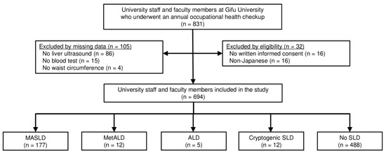 This cross-sectional study evaluated 831 university staff and faculty members who underwent annual occupational health checkups at Gifu University (a general and national university in Gifu, Japan) in June 2023, which was mandatory based on the Occupational Health and Safety Act. The final study included 694 participants based on the inclusion and exclusion criteria (Figure 1). The inclusion criteria were university staff and faculty members who underwent a health checkup and provided written informed consent. The exclusion criteria were self-identification as non-Japanese and missing data. The study protocol was reviewed and approved by the Institutional Review Board of the Graduate School of Medicine, Gifu University (approval no. 2022-237), and conformed to the provisions of the Declaration of Helsinki.