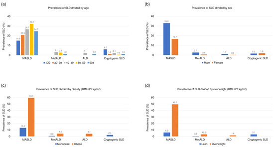 A comparison of the SLD subclasses is shown in Table 1. The prevalence of MASLD, MetALD, ALD, and cryptogenic SLD was 26% (n = 177), 2% (n = 12), 1% (n = 5), and 2% (n = 12), respectively. The bar graphs show a robust relationship between age (Figure 2a), sex (Figure 2b), obesity (Figure 2c), overweight (Figure 2d), and the prevalence of SLD. Comparisons between the SLD subclasses showed significant differences in demographic, clinical, and biochemical parameters (all p < 0.05). The biochemical parameters were generally worse in patients with MASLD than in those with cryptogenic SLD or without SLD. Notably, multiple pairwise comparisons revealed that participants with MetALD had significantly higher GGT levels, lower platelet counts, and higher FIB-4 index values than did those with MASLD (Table 1).