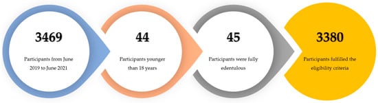 Out of a total of 3469 incoming patients, 3380 (97.4%) fulfilled the eligibility criteria, while 89 participants were excluded from the study. Among the excluded individuals, 44 (1.3%) were younger than 18 years and 45 (1.3%) were edentulous (Figure 1).