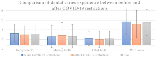 Another aspect potentially contributing to these results could be changes in oral hygiene practices during the lockdown. Altered daily routines may have affected oral care habits. It is plausible that people have more time to focus on oral health, potentially leading to improved hygiene practices. This improvement could contribute to the observed reduction in the decayed teeth count and overall DMFT index. While some studies indicated an increase in the frequency of home oral hygiene maintenance [], others reported a decrease [] or no significant change. Our results suggest an increase in the number of individuals who neglect regular tooth brushing and dental floss usage.