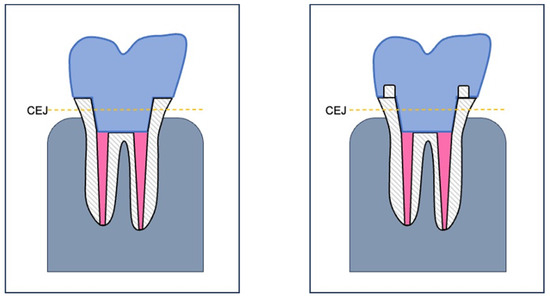 Post-endodontic reconstruction of severely damaged teeth still remains a major challenge for dental practitioners [1]. The loss of tooth structure weakens the remaining substance and increases the risk of fracture [2], potentially resulting in tooth loss [3]. Especially, teeth exposed to high bite forces require adequate restoration after endodontic treatment to minimize risk of fracture, to provide a coronal seal, and to restore functionality [4]. The most commonly used types of restoration in these cases are post and core build-ups and full crowns [3,5]. However, it is generally agreed that post preparation represents an additional iatrogenic weakening of the residual tooth structure, thus increasing the risk of fatal fracture and significantly worsening the prognosis of the tooth [6]. In addition, root canal posts may not be a viable option in certain canal configurations, such as dilated or calcified canals [7].