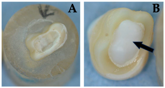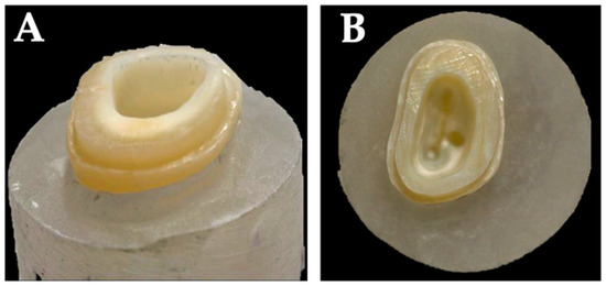 To standardize preparations and to keep variance low, the same researcher completed all preparations. Initially, specimens were decapitated and finished 2 mm above the cemento enamel junction (Figure 2 and Figure 3) using a water-cooled high-speed handpiece (Expertmatic Lux E25L, KaVo©, Biberach, Germany) and diamond burs (FG 158012 and FG 158C012, Horico®, Berlin, Germany). Subsequently, the pulp chamber was accessed and provisional root canal treatment was performed. Canal orifices were explored using ISO 10 and 15 K-files (VDW Dental, Munich, Germany) and prepared with Gates Glidden rotary instruments (size 004 and 006, Anteos® VDW Dental, Munich, Germany) to further simulate endodontic preparation of the pulp chamber and canals. Partially existing pulpal remnants were extirpated and the root canals were sealed with zinc oxide eugenol (Speiko®, Bielefeld, Germany) and phosphate cement (Hoffman Dental©, Berlin, Germany) up to approximately 2 mm apically to the orifices. The use of zinc oxide eugenol cement ensured a bacteria-proof seal of the root canal. However, to prevent the eugenol from impairing the adhesive bond [41,42], this layer was covered with zinc oxide phosphate cement. After the setting of the cement, existing irregularities of the pulp chamber walls were leveled and a slight divergence was prepared. Furthermore, excess was removed and transitions of the pulp walls to the occlusal area were finished with a diamond bur (FG291 C 014 Horico®, Berlin, Germany).