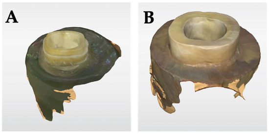 Screenshots of the scanned preparations. Scanning was performed using the CEREC®-Primescan ((A) = endocrown preparation with ferrule; (B) = classical endocrown preparation).