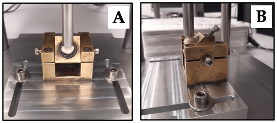 The image displays a test sample secured within a fixture, which is loaded with an 8 mm diameter cylindrical, stainless-steel piston ((A) = frontal view). The piston has been mounted onto the mesio-palatal cusp for the upper molars and the centro-buccal cusp for the lower molars ((B) = lateral view).