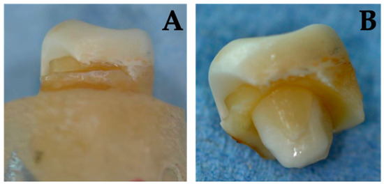Irreparably fractured sample from the FA group. The longitudinal fracture and the involvement of the endocrown are clearly visible (B). However, the endocrown is exclusively fractured in the marginal area (A).