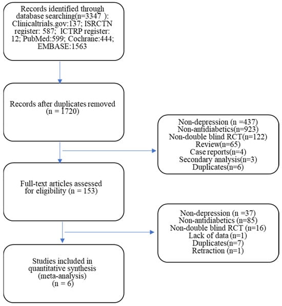 Three electronic databases, PubMed, Embase, and the Cochrane Library, and three clinical trial registry websites (clinicaltrials.gov, accessed on 9 December 2023, ISRCTN registry, and ICTRP registry) were searched with the language restricted to English and Chinese by two independent reviewer groups (RS and YC, a two-reviewer group, and JZ a one-person group). We also searched the gray literature for unpublished studies. The keywords “depression”, “bipolar disorder”, “hypoglycemic agents” and “randomized controlled trial” and relevant Mesh words and text words were connected using Boolean operators to identify eligible studies published up to October 2023. A manual search of the references in relevant articles was also conducted as a supplemental approach. The detailed search strategy and search results are presented in Appendix A (Table A1).