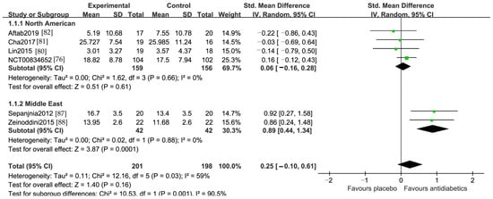 The associations between diets and systemic inflammation, and between diets and behaviors, have been studied. A United Kingdom biobank study found that low-grade inflammation was a mediator between diet and behavioral disinhibition []. It is reported that the prudent diet was negatively, and the meat-based diet, such as the Western style food, was positively associated with several pro-inflammatory biomarkers []. It is also reported that the insulin insensitivity caused by pro-inflammatory cytokines may result in metabolic abnormalities that are associated with depression []. Moreover, pro-inflammatory cytokines may directly cause depressive symptoms []. A bidirectional relationship between depression and inflammation has been supported by a large number of studies [,]. Importantly, a number of studies support the anti-inflammatory effect of a Mediterranean diet []. Antidiabetics also have anti-inflammatory effect []. However, the results of our meta-analysis suggest that the anti-inflammatory effect of antidiabetics alone may not be enough to cause significant differences between an antidiabetic and placebo in reducing depressive symptoms. The positive finding from the Middle East studies and negative finding from North American studies suggest that different diets may create different conditions for antidiabetics to produce an antidepressant effect in MDD or bipolar depression. The condition for the antidepressant effect of antidiabetics might be the level inflammation, i.e., no inflammation or low-level of inflammation.