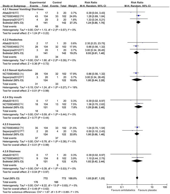 Three studies reported adverse events in the gastrointestinal tract (nausea/vomiting/diarrhea) and headaches [,,]. There was no significant difference between the active arm (n = 141) and the placebo (n = 142) in terms of the gastrointestinal side effects, with an RR of 1.24 (95% CI 0.88, 1.76), and headaches, with an RR of 0.93 (95% CI 0.61, 1.40), respectively. Two studies reported sexual dysfunction and insomnia [,]. There was no significant difference between the active arm (n = 124) and the placebo (n = 122) in terms of sexual dysfunction, with an RR of 1.00 (95% CI 0.44, 2.28), and insomnia, with an RR of 1.00 (95% CI 0.68, 1.46), respectively. Two studies reported dry mouth and dizziness [,]. There was also no significant difference between the active arm (n = 121) and the placebo (n = 122) in terms of dry mouth, with an RR = 1.29 (95% CI 0.68 to 2.46), and dizziness, with an RR of 1.02 (95% CI 0.42, 2.44), respectively (Figure 7). The heterogeneity for all these side effects was 0%.