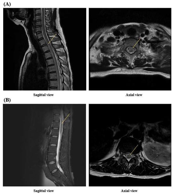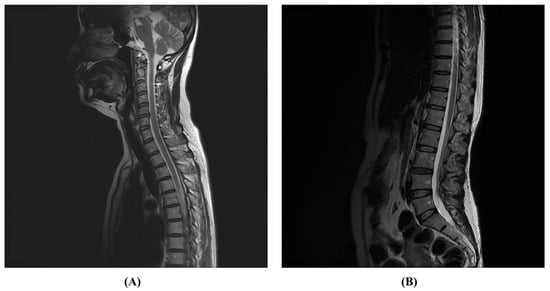 These figures are T2-weighted images of a spine MRI performed 7 months after onset. Compared to the previous MRI, it can be seen that longitudinally extensive transverse myelitis (LETM) findings from the T2 vertebral body segment to the T12 vertebral body segment disappeared. (A): Sagittal view on T2-weighted MRI imaging at the cervical and thoracic spine level, (B): Sagittal view on T2-weighted MRI imaging at the thoracic and lumbar spine level.