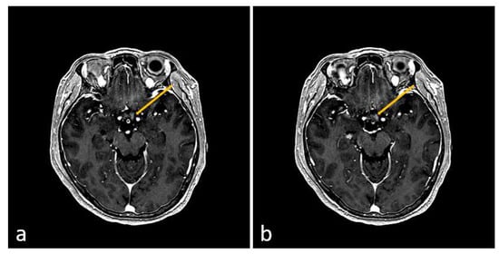 In (a), the arrow indicates high signal intensity of the left optic nerve on the T1 contrast-enhanced image of the brain MRI, and in (b), the arrow indicates high signal intensity of the optic chiasm on the T1 contrast-enhanced image of the brain MRI. These are important imaging findings in the diagnosis of NMOSD.
