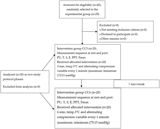 Two experimental sessions of different CC durations were performed in the same group with a one-week break. The first session was with a stimulation time of 3 min—(CC3), (n = 20) and the second session with 6 min (CC6), (n = 20) (Figure 2). After determining the widest cross-section of the flexor carpi radialis (FCR) muscle of the dominant hand under ultrasound control, the measuring part was marked with a marker [3]. All of the measurements were taken at the same point. The following measurements were taken in all participants of the study: muscle tone (T—[Hz]), stiffness (S—[N/m]), elasticity (E—[arb]), pressure pain threshold (PPT—[N/cm]), microcirculation response described in non-reference units (PU), and maximum isometric force (Fmax—[kgf]). All participants were tested at the same time and under the same conditions (between 10 a.m. and 12 p.m.) in a standardized resting position, sitting in a medical chair with elbows bent at 60° and leaning against the chair [3]. The project was carried out in the Provita Medical Center. All measurements were taken at rest—(pre) 2 min before CGR stimulation and 2 min after CGR—(post). Properly trained physiotherapists performed the measurements. All measurements were taken in the following order: (1) PU, (2) T, (3) S, (4) E, (5) PPT, (6) Fmax, and the procedures are described in detail below.