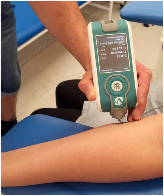 Myotonometry is a reliable measurement method and can detect differences in physical properties of muscles [31,32,33,34], e.g., state of resting muscle tone (T) defined as muted EMG signal and dynamic stiffness (S) [33] and elasticity (E) [35]. The myotonometer test was performed as the second resting and post-stimulation measurement (Figure 3). Measurements were performed using a myotonometer MyotonPRO AS (Myoton Ltd., Tallin, Estonia 2021). Through the probe, a pre-pressure (0.18 N) is applied to the body surface and causes the compression of the material underneath. The device releases a mechanical impulse (0.4 N, 15 ms), deforming the medium for a short interval. Three measurements were taken, and the average values were calculated.