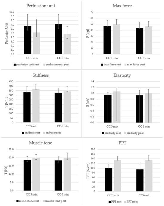 The Shapiro–Wilk tests indicated that the normality of the data had been violated for PU and T. Therefore, for these parameters to investigate statistical differences, Friedman’s test was used. The Friedman’s test showed significant differences between CC3 and CC6 for PU (Chi-square ANOVA = 31.1; p < 0.001; Kendall’s W = 0.52) and for T (Chi-square ANOVA = 14.57; p = 0.002; Kendall’s W = 0.25). The pairwise comparisons for PU showed significant differences between rest vs. post values for CC3 (p = 0.001; 6.67 ± 2.84 vs. 5.15 ± 2.34, respectively) as well as between rest vs. post values for CC6 (p < 0.001; 7.13 ± 3.21 vs. 4.76 ± 1.82, respectively). The pairwise comparisons for T showed significant differences between rest vs. post values for CC3 (p = 0.03; 18.58 ± 2.06 vs. 19.90 ± 2.79 [Hz]) as well as for pre- vs. post values for CC6 (p = 0.02; 18.19 ± 1.98 vs. 19.66 ± 3.27 [Hz]).