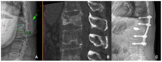 Figure 3. Standing X-ray (A) shows the patient’s 17° kyphotic deformity of the vertebral body with a spinous process fracture (green arrow) type 5 OF. CT scan (B) shows the upper and lower endplate components. Postoperative standing X-ray (C) shows the percutaneous vertebral reconstruction and augmented posterior fixation.
