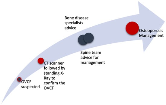 After considering every aspect of the management of OVCFs, we were able to develop an algorithm for clearing these fractures in cases of spontaneous aLBP or after a low-energy trauma. The algorithm aims to prevent missed OVCFs and to make physicians aware of the need for multidisciplinary collaboration. Avoiding unnecessary complementary examinations reduces costs and improves care management in EDs. Indeed, OVCFs, similar to low-energy trauma hip fractures, are a multifactorial problem engendering a variety of consequences on patients’ general health, and multidisciplinary approaches are important for obtaining the best clinical, functional and psychological results for our patients [73,74]. Multidisciplinary osteoporosis care management is associated with earlier treatment initiation and appreciably lower rates of repeat fracture and mortality [74,75].