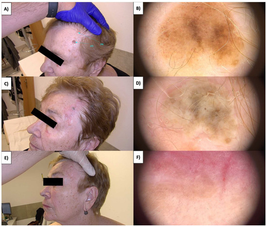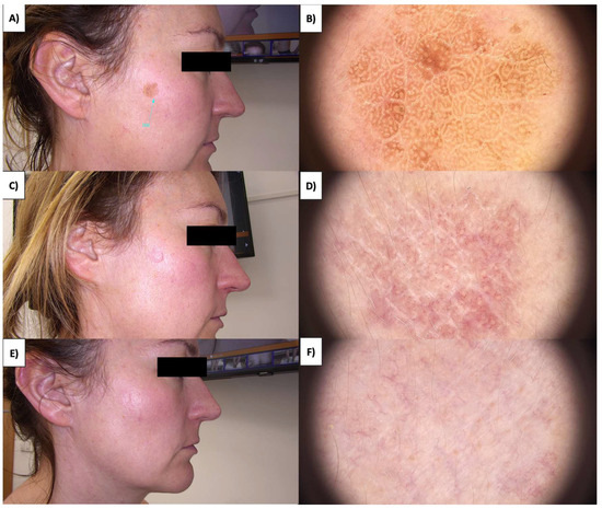 In the case of more sessile, less keratinized lesions, the treatment typically commences at the lesion’s periphery while preserving a small margin of healthy tissue (Figure 1 and Figure 2). Initially, the structures whiten, and a grayish granularity emerges, followed by scab formation. Upon detachment of the scab, pink, structureless areas with numerous tortuous vessels, often branching, looping, and occasionally displaying dot-like and reticular patterns, become evident. Interestingly, in these lesions during the healing process, an emerging pattern of lattice fibrosis can be observed (Figure 1D and Figure 2E).