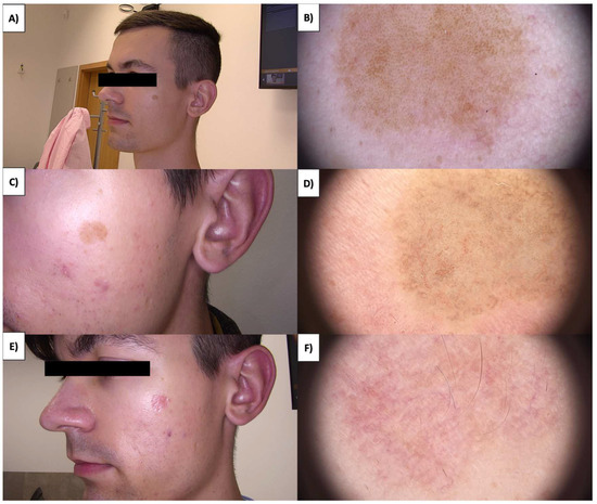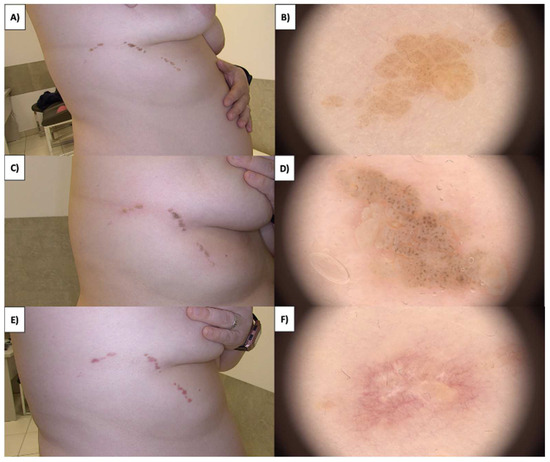 Sebaceous nevi (NS) are found on both the hairy scalp and the trunk’s skin (Figure 8A,B). They often present as extensive lesions and can manifest as early as childhood, sometimes even from birth. Over time, they develop a verrucous character with brown verrucous structures. An emergence of amorphous white-gray structures within the treated area is observed after HIFU treatment of NS (Figure 8C,D). Subsequently, a crust forms, and approximately one month post treatment, a pink area with branching linear vessels and short linear vessels appears (Figure 8E,F). Numerous multifaceted structures are observed in the fibrotic transformation process, as well as white lines and faintly demarcated areas with reflective properties under polarized light. The healing process takes about three months, during which there is a reduction in white lines and poorly demarcated areas, leading to clear skin with no therapeutic changes.