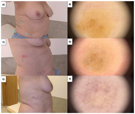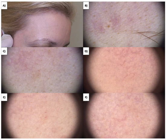 In the case of superficial lesions, such as those on the lips, where a nodular pattern is observed, the procedure results in whitening in the form of a homogenous, perfectly circular area with a grayish vessel at the central portion (Figure 6A–D). Shortly after, the lesion undergoes healing, the crust falls off, and punctate and linear vessels appear on a pink background. Over time, the number of vessels decreases, and the skin becomes completely clear (Figure 6E,F).