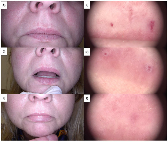 (A) Small capillary malformations in the lip—macroscopic view. (B) Small capillary malformations in the lip before treatment—dermoscopic view. (C) Small capillary malformations in the lip immediately after HIFU treatment—macroscopic view. (D) Small capillary malformations in the lip immediately after HIFU treatment—dermoscopic view. (E) Healing process of the lip one month after HIFU treatment—macroscopic view. (F) Healing process of the lip one month after HIFU treatment—dermoscopic view.