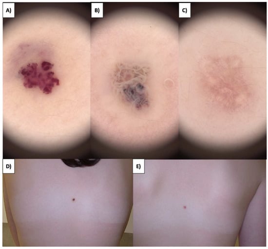 (A) Campbell angioma of the back before treatment—dermoscopic view. (B) Campbell angioma of the back immediately after HIFU treatment—dermoscopic view. (C) Healing process of Campbell angioma of the back one month after HIFU treatment—dermoscopic view. (D) Campbell angioma of the back before treatment—macroscopic view. (E) Healing process of Campbell angioma of the back one month after HIFU treatment—dermoscopic view.