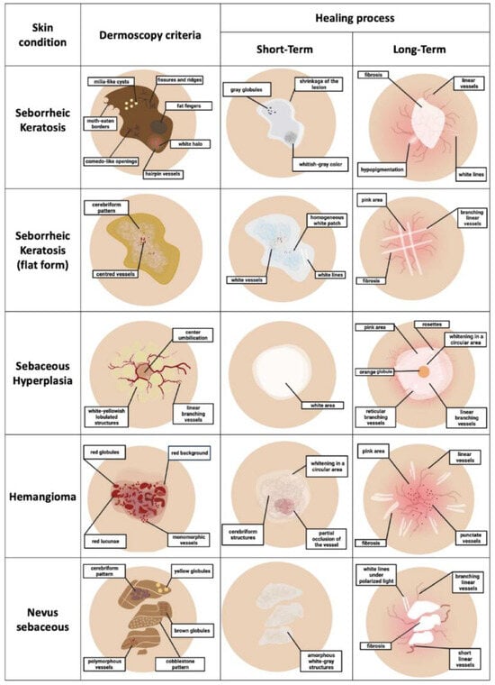 HIFU is a method increasingly used in dermatology, which has recently gained tremendous interest [19,20,21,22,23]. To our knowledge, this is the first analysis focusing on the dermoscopic features observed during the healing period after HIFU treatment. Numerous studies provide evidence that HIFU at lower frequencies (1–5 MHz) affects skin rejuvenation [24,25,26,27]. Furthermore, HIFU offers advantages in the formation and reorganization of collagen, and a potential explanation for this effect could be an elevation in TGF-β levels along with the inhibition of MMP3 activity [24]. Furthermore, HIFU is recognized for its capability in non-surgical facial and body contouring, providing a safer and non-invasive alternative to traditional methods, effectively targeting fat tissue for contouring purposes in areas such as the abdomen, face, and neck [28]. Additionally, HIFU is known for its safety, with the most common adverse effect being transient pain during the procedure, while other significant adverse effects are notably rare, thus establishing it as a relatively safe option for skin treatment [29,30]. Importantly, the application of high-frequency HIFU, i.e., at 20 MHz, demonstrates an exceptionally high cure rate in treating premalignant lesions coupled with a favorable safety profile [23]. The HIFU treatment induces a targeted thermo-mechanical insult, typically accompanied by a wheal and flare response, reaching its peak after 5–10 min, and gradually subsiding over the following 10–30 min. Within a few days, a superficial dry wound may develop [23]. This wound tends to heal spontaneously over the course of several days or weeks, undergoing an initial phase of inflammation and potentially crustation. Notably, instances of HIFU-induced superficial dry ulceration or crustation resolve within a few weeks. Understanding the specific changes and timelines involved in the healing process contributes to a more holistic comprehension of HIFU’s dermatological applications. The outcomes of our exhaustive investigation furnish valuable insights into the healing kinetics subsequent to HIFU procedures for prevalent cutaneous lesions, including seborrheic keratosis, sebaceous hyperplasia, vascular lesions, and sebaceous nevi.