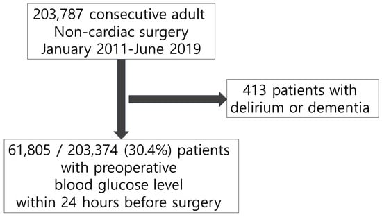 This study used data from the Samsung Medical Center—Non-Cardiac operation (SMC-NoCop) registry (KCT 0006363). This cohort contains single-center de-identified data of 203,787 consecutive adult patients who underwent non-cardiac surgery at Samsung Medical Center, Seoul, Republic of Korea, between January 2011 and June 2019. For the analysis, we excluded patients who had a preoperative history of delirium or dementia and those without blood glucose level measurements within 24 h before surgical incision.